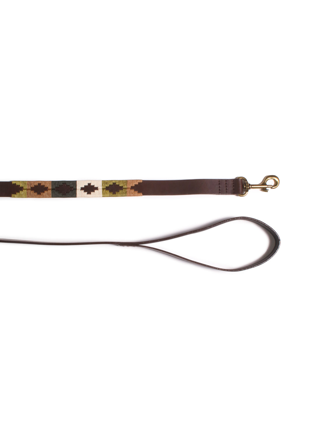 Original, handmade Argentinian dog lead made in genuine, vegetable-tanned leather and embroidered by hand with high-density packed yarn. The troughs and diamonds in the designs are said to represent the colossal peaks of the Andes. Match your lead with the collar and make your pet cool!
