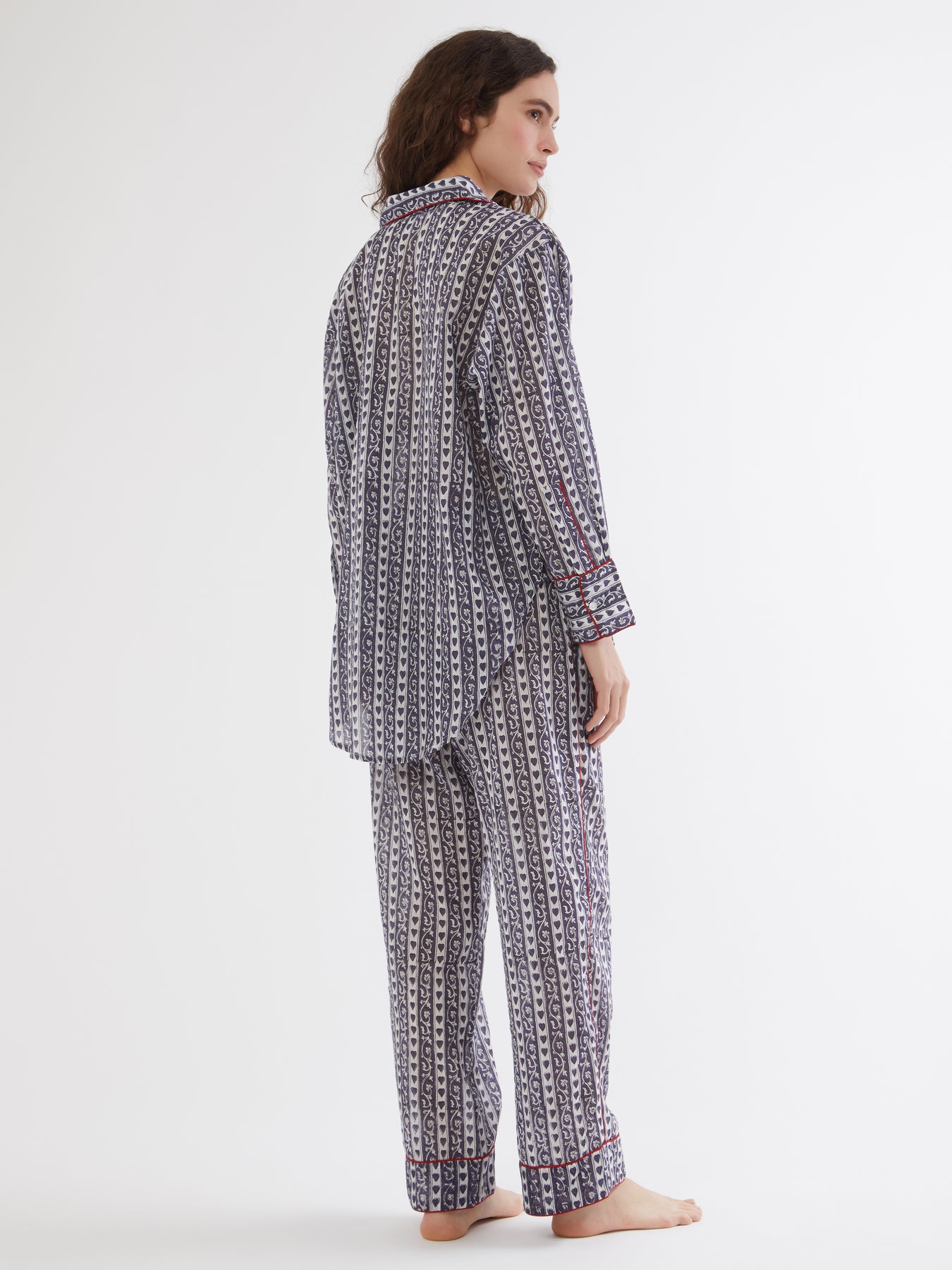 Set of cool and lightweight cotton pajama with colorful block print patterns handmade in India using ancient techniques. Its oversized fit gives a relaxed mood with wide leg and full-length button front. Detailed with colored piping along the seams, pockets at the sides and an elasticated waist with adjustable cord. It comes a with a lovely coordinated pouch to carry always in your holiday bag!