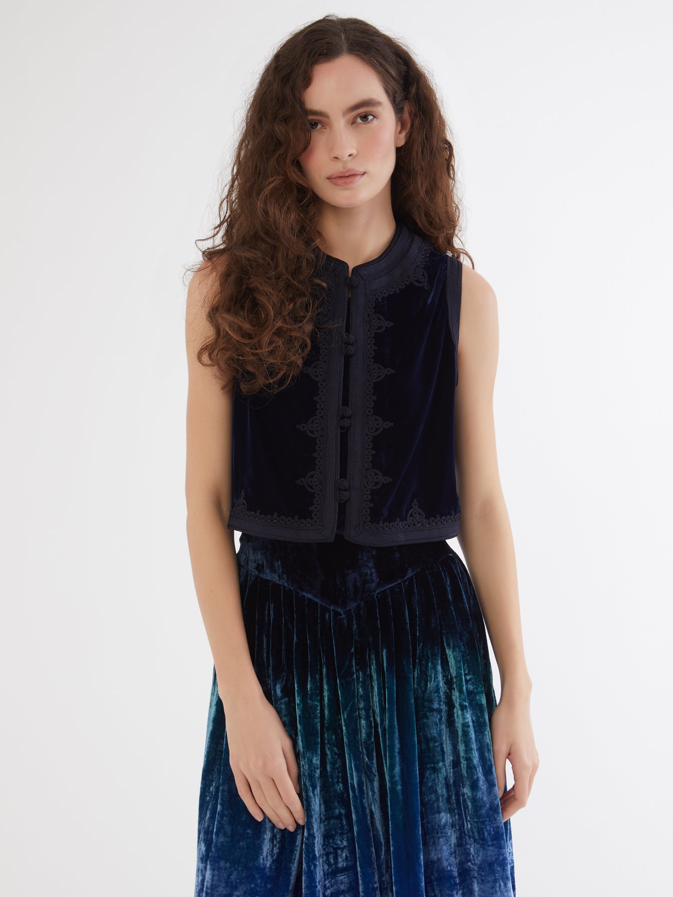 This traditional embellished vest is made with 100% velvet fabric and embroidered in contrasting or ton-sur-ton 100% silk trims. These pieces are completely lined with 100% silk lining making them the perfect tailored vest. These garments are entirely handmade in Marrakech and can be worn to complete an elegant look or to give a touch of Bohemian to any casual attire.